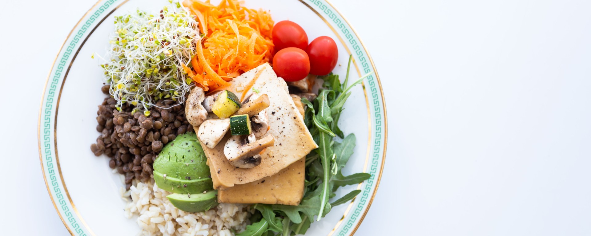 - Assembler l’assiette au goût. Je n’ajoute personnellement pas de vinaigrette dans ce repas ; le goût du tofu mariné et des avocats est suffisant.